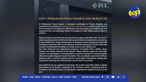 Consultant cardiologue à l’hôpital Victoria, le Dr Domah a été reconnu coupable de deux chefs d’accusation pour avoir accepté un avantage indu dans un but corruptif, en violation de la section 15(a) de la Prevention of Corruption Act (PoCA) de 2002. En revanche, la co-accusée, Azur Medical Ltd, a été acquittée des accusations de traitement d’un officier public dans un but corruptif, prévues à la section 14 de la même loi.
