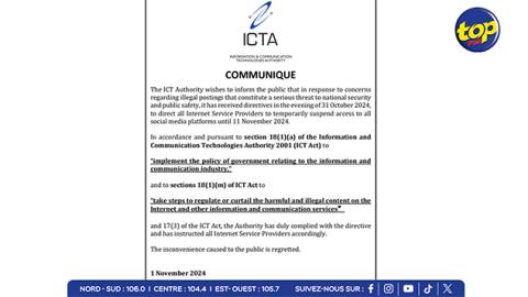 Main picture ICTA : Suspension temporaire de l’accès aux réseaux sociaux jusqu'au 11 novembre voir plus