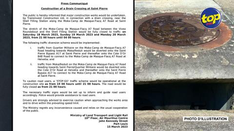 Main picture Travaux en relation avec un drain à St Pierre : La route A7 sera fermée dans la soirée du 18, 19 et 20 mars voir plus