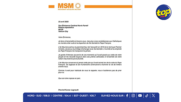 Shane: Le 23/04/2025 à 20:09 | MAJ à 23/04/2025 à 20:10 Main picture Publié : Le 23/04/2025 à 20:09 | MAJ à 23/04/2025 à 20:10 FB TW WS Message de Pravind Jugnauth suite au décès du Pape François