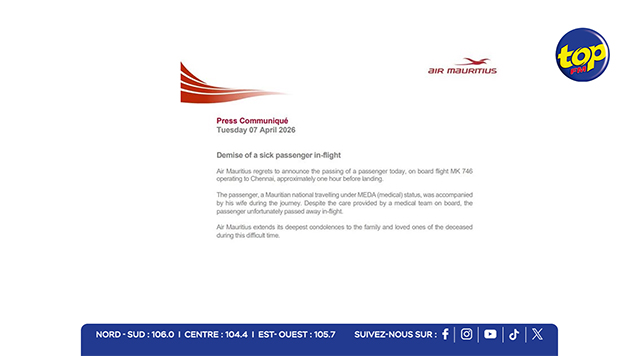 Dans un communiqué, Air Mauritius a exprimé sa profonde tristesse face à cet événement et a présenté ses sincères condoléances à la famille et aux proches du défunt.