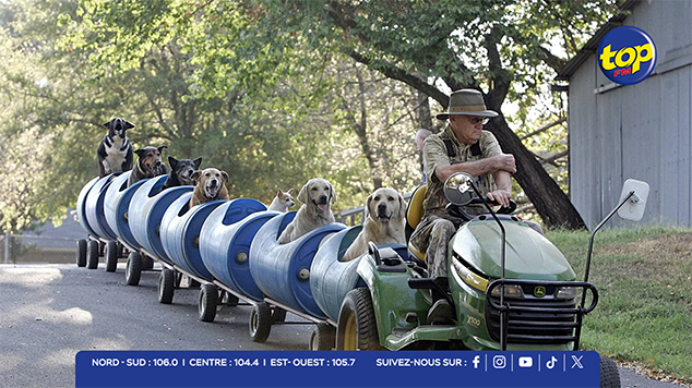 Son convoi, tracté par une tondeuse autoportée spécialement adaptée, ne passe pas inaperçu. Derrière le volant, le retraité guide une série de compartiments sécurisés et confortablement aménagés, où les chiens prennent place comme de véritables passagers. À chaque sortie, les museaux se dressent au vent et les queues s’agitent.