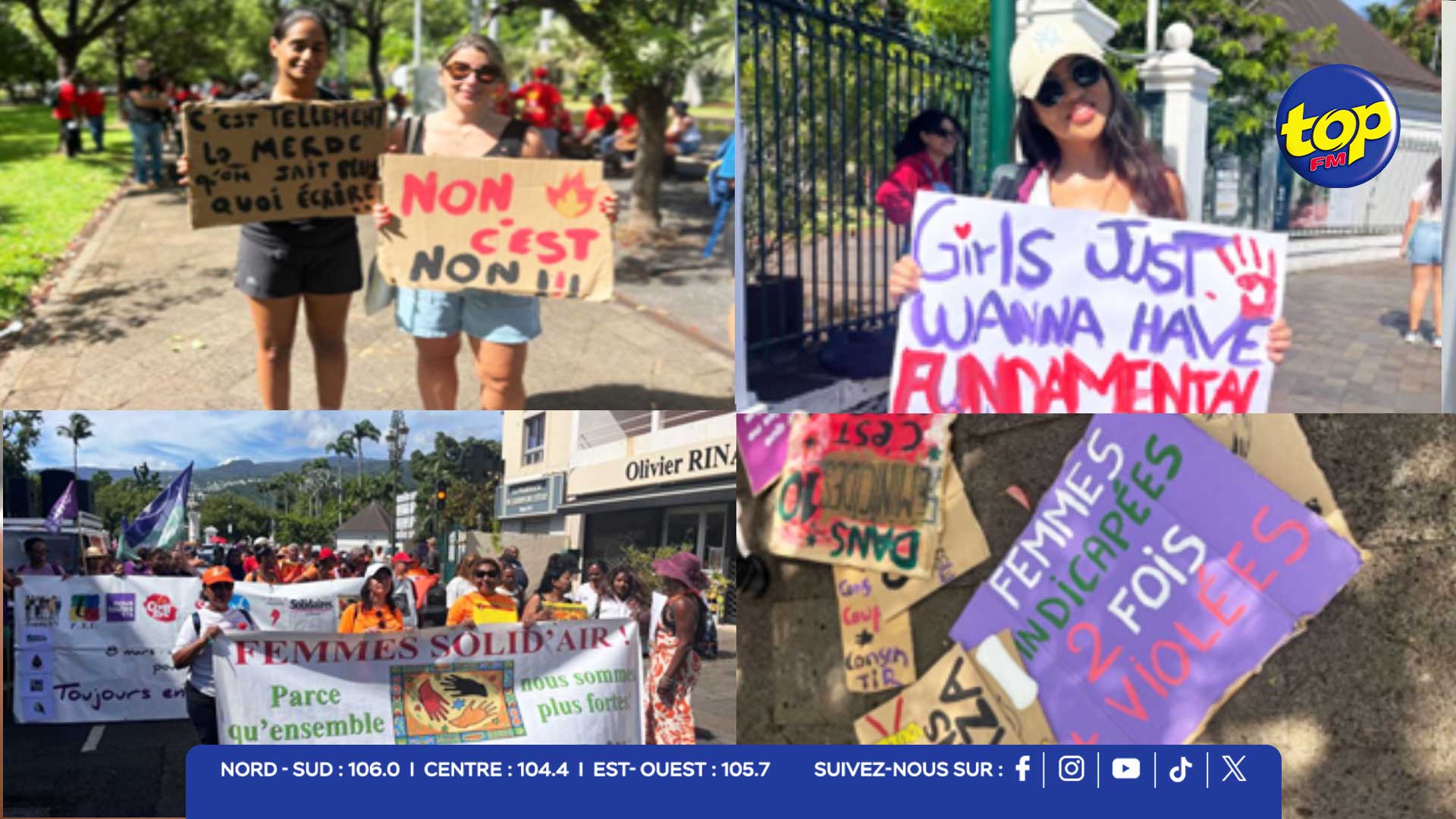 À l’occasion de la Journée internationale des droits des femmes, une centaine de personnes ont défilé ce 8 mars à Saint-Denis, à l’appel d’associations et de syndicats locaux, dont Chancegal, Femmes Solid'Air, Nous Toutes 974, la Ligue des Droits de l’Homme, FSU, CGTR et FO Réunion. Le cortège est parti du Jardin de l’État pour rejoindre les Jardins de la Préfecture, pancartes en main, rappelant que cette journée n’est pas une fête mais un moment de lutte.