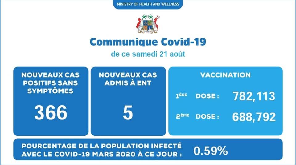 Naresh: Le 21/08/2021 à 13:14 | MAJ à 10/07/2024 à 19:00 Main picture Publié : Le 21/08/2021 à 13:14 | MAJ à 10/07/2024 à 19:00 FB TW WS C’est ce qui ressort d’un communiqué émis cet après-midi. 5 patients, sur les 371 cas, sont admis à l’hôpital ENT. Depuis le 18 mars 2020, 0,59% de la population a été contaminé par la Covid-19. 782 113 personnes ont obtenu la première dose d’un vaccin et 688 792 les deux doses.