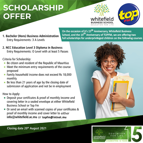 Main picture Bourses d’études offertes par Whitefield Business School et Top FM à deux étudiants issus de milieu modeste : Vous avez jusqu’à demain ( 20 aout ) pour soumettre vos applications voir plus