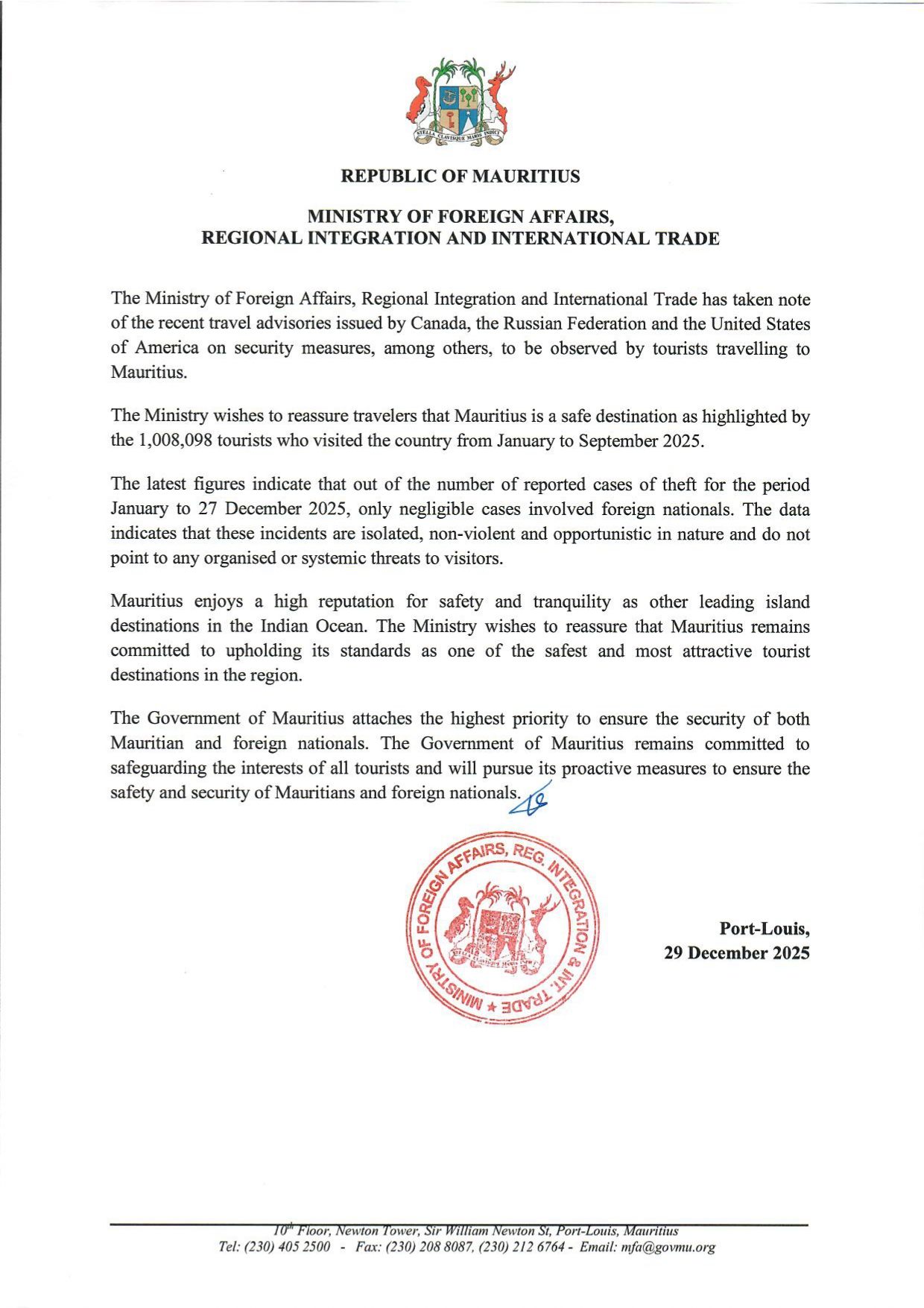 Le ministère tient à rassurer les touristes : Maurice demeure une destination sûre, comme en témoignent plus d’un million de visiteurs accueillis entre janvier et septembre 2025. Les données officielles montrent que, parmi les cas de vol signalés jusqu’au 27 décembre 2025, seuls quelques incidents ont concerné des étrangers. Ces affaires sont isolées, non violentes et opportunistes, et ne reflètent en rien une menace organisée ou systémique, souligne le Ministère des Affaires étrangères.