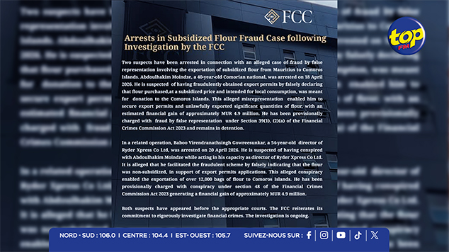 Deux suspects ont été arrêtés dans le cadre d’une affaire présumée de fraude impliquant l’exportation illégale de farine subventionnée depuis Maurice vers les Comores. Cette opération fait suite à une enquête menée par la Financial Crimes Commission (FCC).
