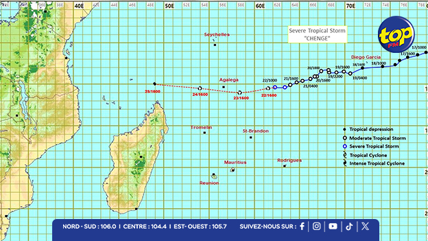 La tempête tropicale CHENGE, qui était modérée durant la nuit, s’est renforcée et atteint désormais le stade de forte tempête tropicale. À 04h00, le centre de CHENGE se situait à 10,4°S et 63,4°E, soit à environ 735 km à l’est d'Agaléga. Elle progresse vers l’ouest-sud-ouest à 15 km/h, constituant une menace directe potentielle pour l’île.