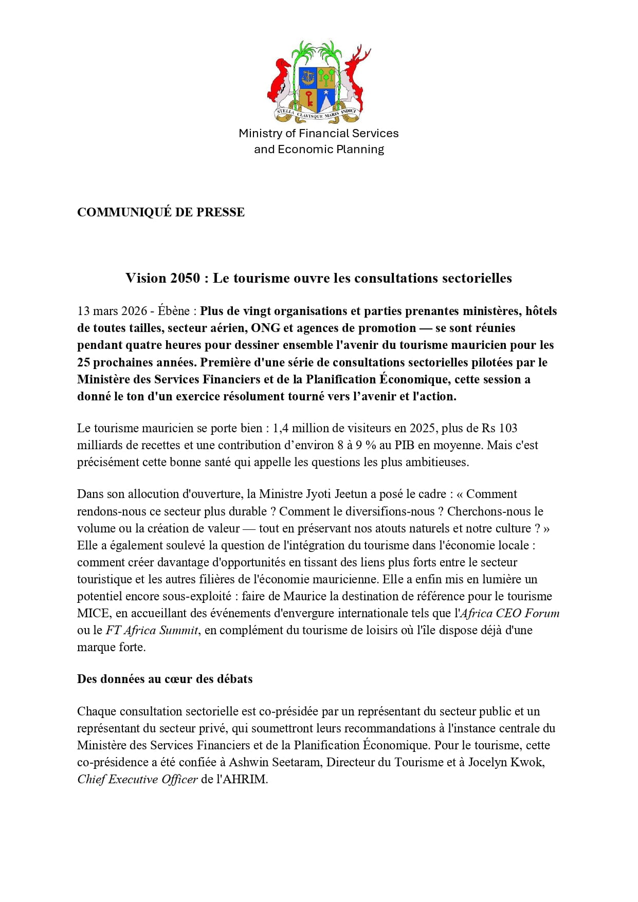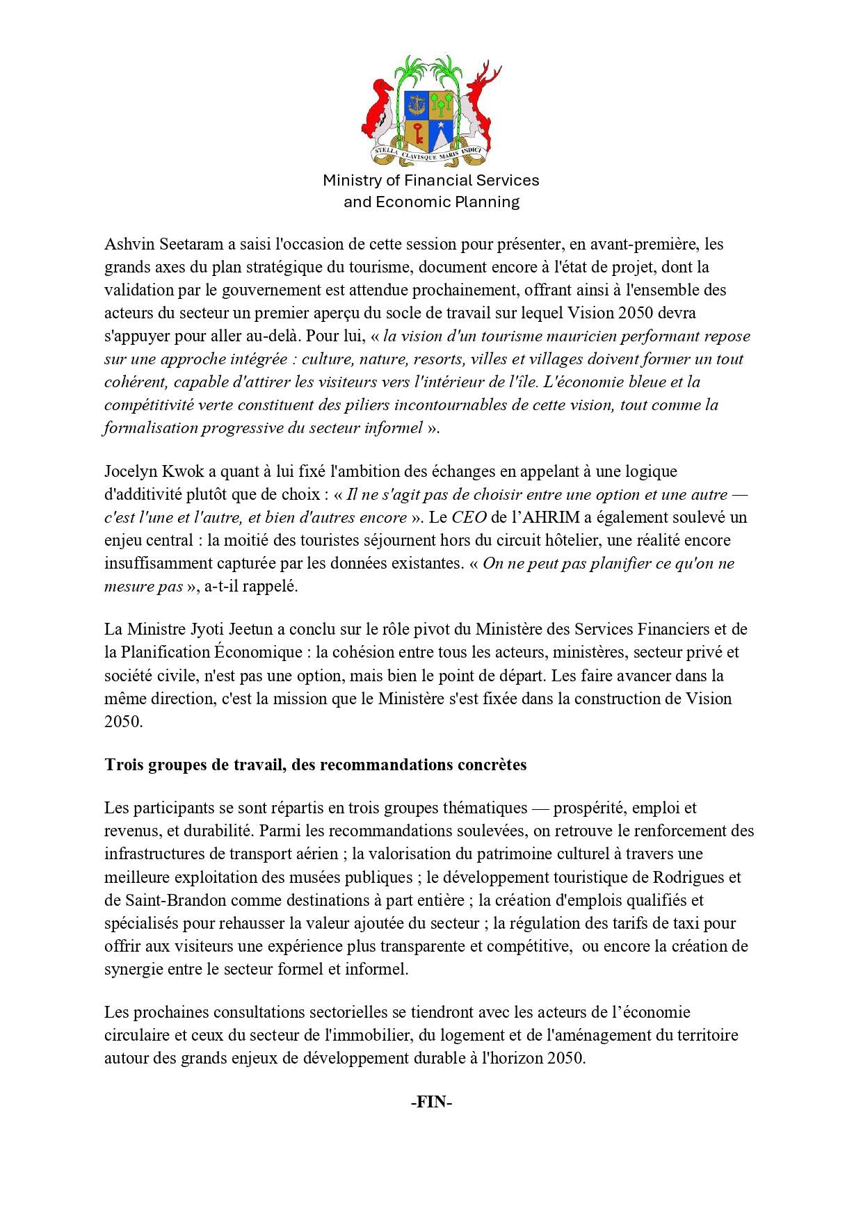 La consultation était coprésidée par Ashwin Seetaram, directeur du Tourisme, et Jocelyn Kwok, CEO de l’AHRIM. Trois groupes de travail – prospérité, emploi et revenus, et durabilité, ont formulé plusieurs recommandations, dont le renforcement du transport aérien, la valorisation du patrimoine culturel et le développement de Rodrigues et Saint-Brandon comme destinations touristiques.