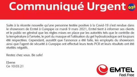 Main picture Suite à la nouvelle qu’un collégien testé positif à la Covid-19 s’est rendu dans sa succursale de Curepipe : Emtel indique que tous les tests PCR effectués sur ses employés se sont avérés négatifs voir plus