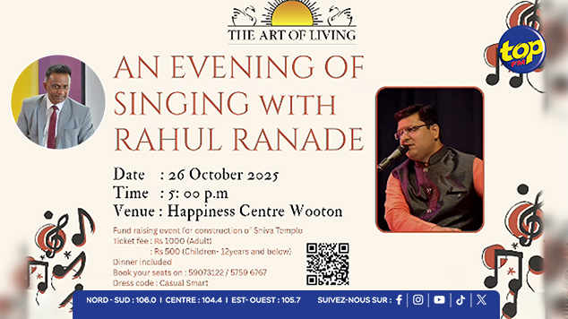 Art of Living Mauritius tiendra une Singing Night animée par l’artiste international Rahul Ranade, le dimanche 26 octobre à 17h, au Happiness Centre à Wooton.