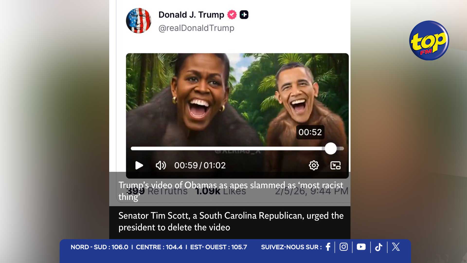 Une vive controverse a éclaté aux États-Unis après la diffusion, puis le retrait, d’une vidéo associée à Donald Trump montrant Barack et Michelle Obama avec leurs visages incrustés sur des singes, sur fond musical du titre The Lion Sleeps Tonight. Le contenu, partagé sur le réseau Truth Social, a été largement dénoncé comme raciste, y compris par des responsables des deux camps politiques.