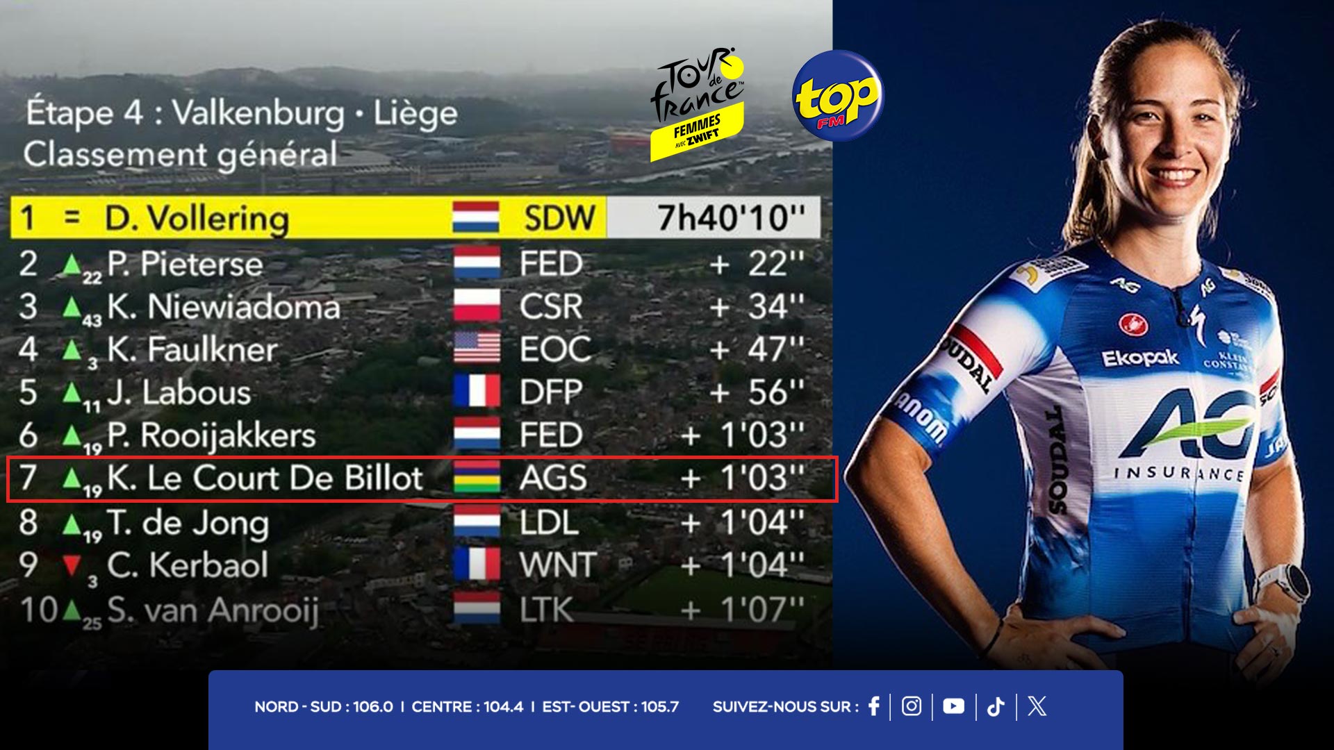 Grace à cette performance remarquable, elle grimpe à la septième place du classement général à une minute 3 secondes du maillot jaune, Demi Vollering.