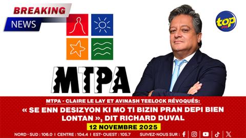 Main picture MTPA - Claire Le Lay et Avinash Teelock révoqués: « Se Enn Desizyon Ki Mo Ti Bizin Pran Depi Bien Lontan », dit Richard Duval voir plus