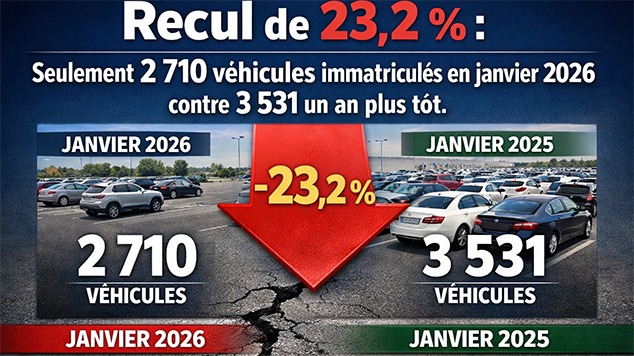 Selon les chiffres, 3 531 véhicules avaient été immatriculés en janvier 2025. En janvier 2026, le volume recule de 23,2 %, pour s’établir à seulement 2 710 véhicules. Cette première baisse traduit un affaiblissement de la demande, touchant à la fois les véhicules neufs et les véhicules d’occasion importés, alors que les coûts liés à l’achat et à l’exploitation augmentent.