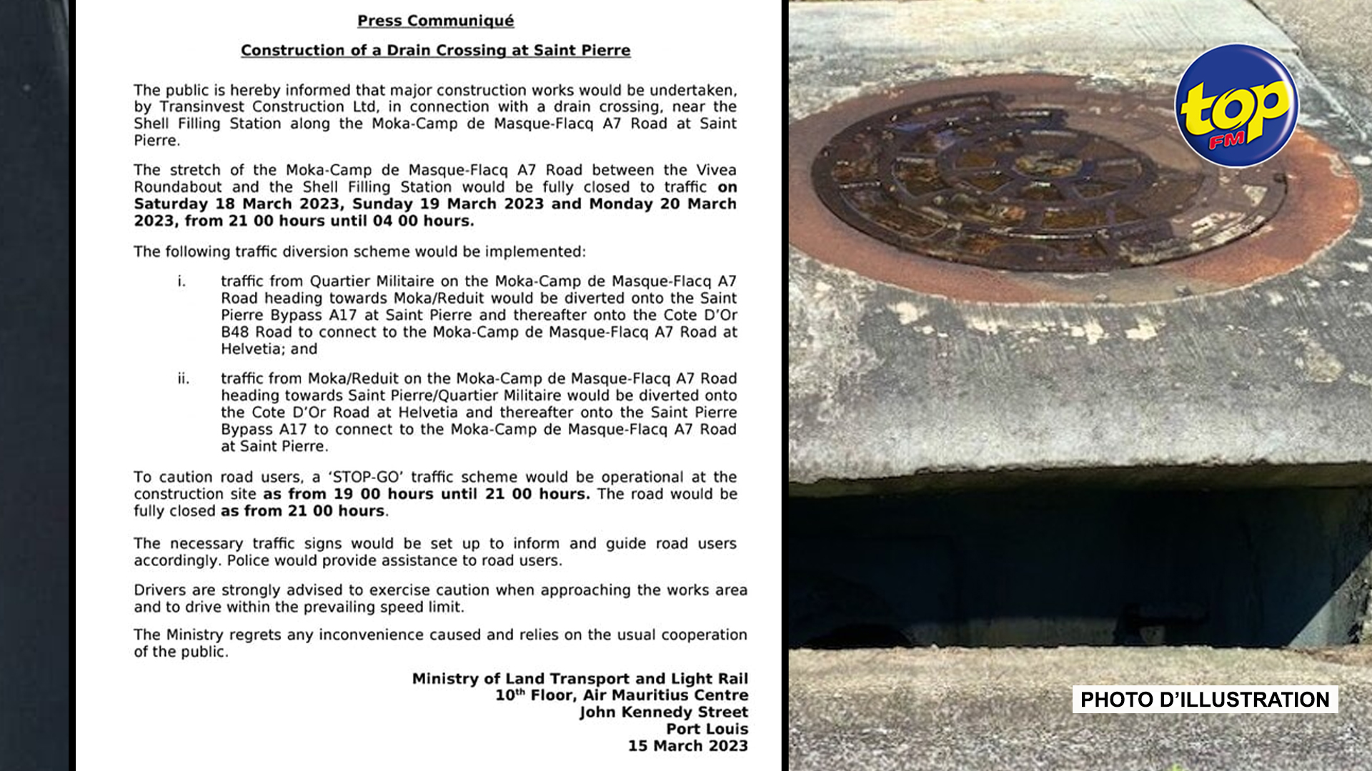 C’est ce qui ressort d’un communiqué du ministère des Transports. Le public est informé que des travaux de construction seront entrepris le long de la route A7, soit Moka-Camp de masque-Flacq entre le rond-point de Vivea et la station-service Shell. De ce fait, la route sera complètement fermée à la circulation le samedi 18 mars, le dimanche 19 mars et le lundi 20 mars, de 21 heures à 4 heures le lendemain.