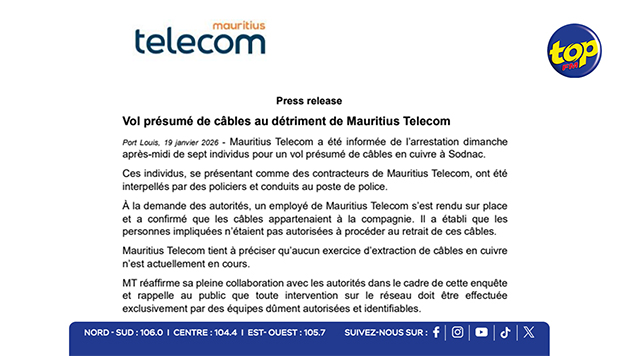 Mauritius Telecom précise qu’aucune opération d’extraction de câbles n’est actuellement en cours. La société réaffirme sa pleine coopération avec les forces de l’ordre et rappelle au public que toute intervention sur le réseau doit être réalisée uniquement par des équipes officiellement autorisées et clairement identifiables.