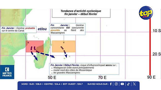 Dans les cinq prochains jours, une circulation dépressionnaire pourrait se former au nord des Mascareignes, lundi ou mardi. Toutefois, la probabilité qu’elle évolue en tempête tropicale modérée devient faible à partir du mardi 27 janvier. Une seconde circulation dépressionnaire pourrait apparaître dans le canal du Mozambique en début de semaine prochaine, avec également une faible chance d’atteindre le stade de tempête tropicale modérée à partir du mercredi 28 janvier.
